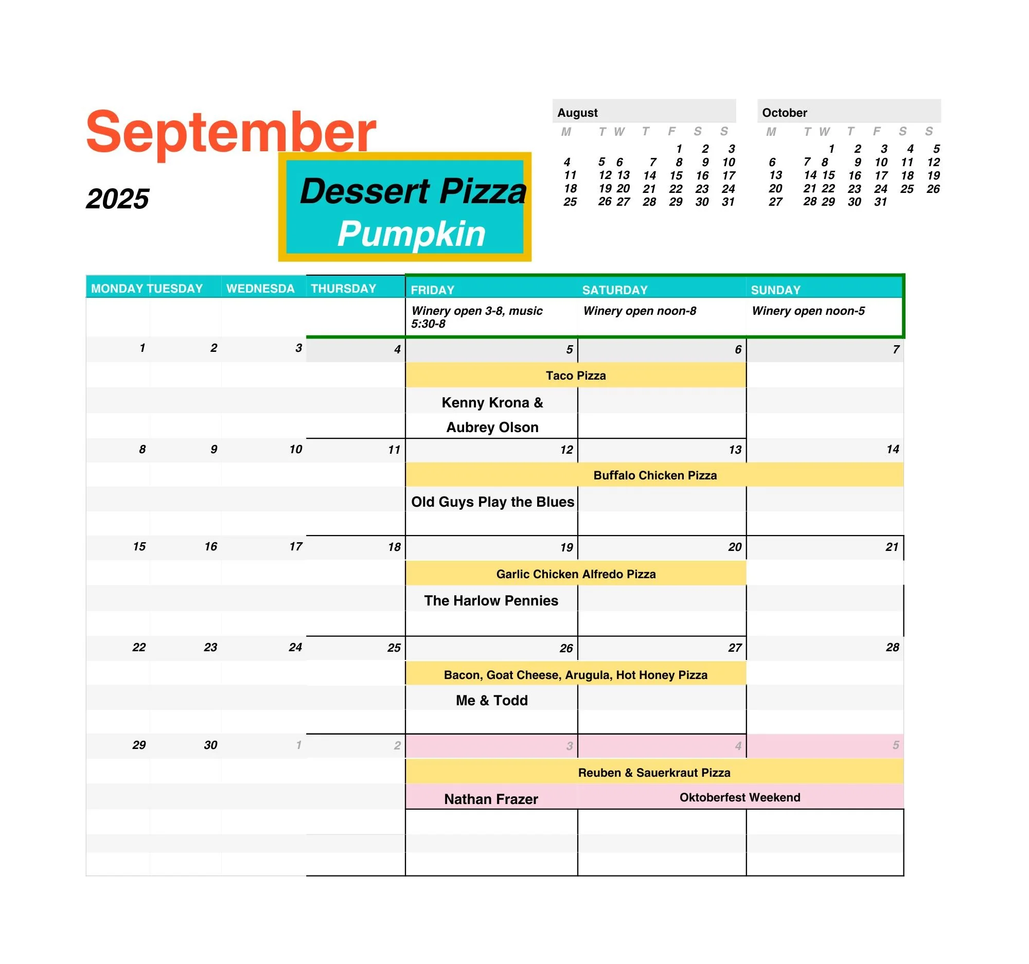The winery is open to the general public (including bachelorette parties and rehearsal dinners!) If you’re looking for a private rental, we can do that, too! We offer a fun Groom's Dinner package with a pizza buffet dinner in private space under a tent. The winery is also available to rent when we're not open to the public at $75/hour with a 3 hour minimum.